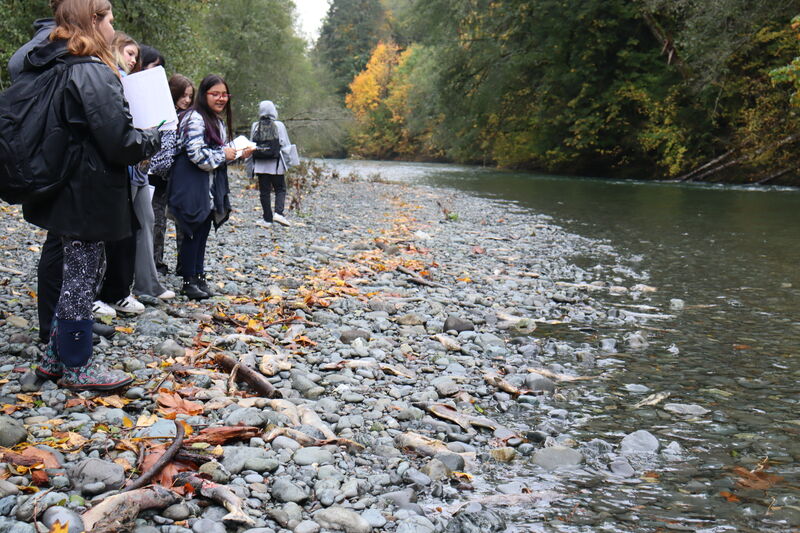 Chimacum students took a field trip to Duckabush Oxbow and Wetlands Preserve in November, during salmon spawning season. (Note the salmon remains on the ground.)